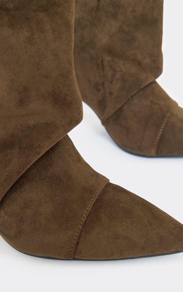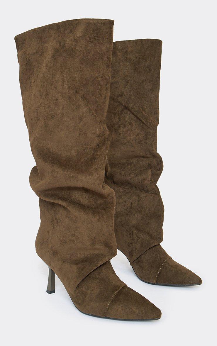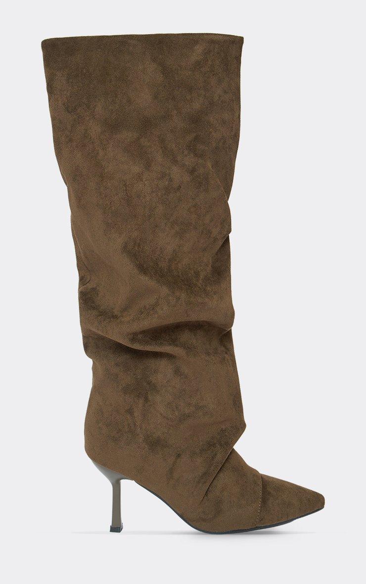 Charter Stud Detail Pointed Toe Knee High Boot In Taupe Faux Suede