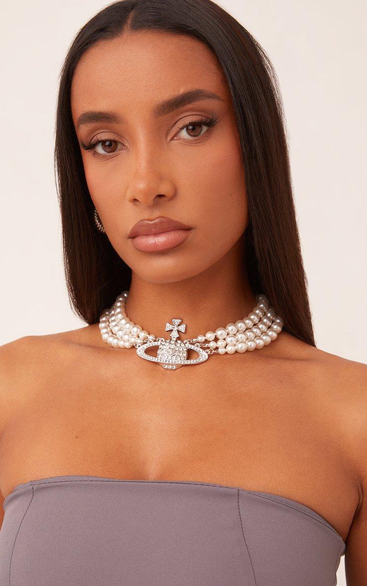 diamante pearl detail multi choker necklace in silver