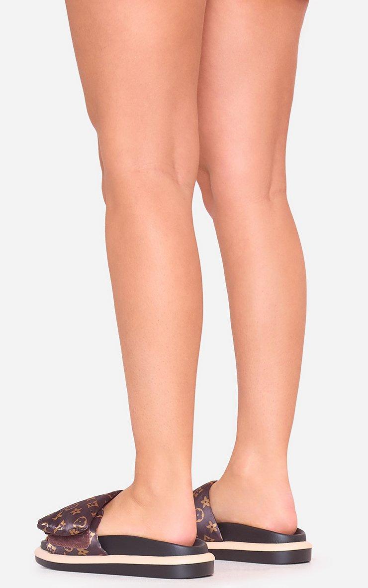 Manic Printed Detail Peep Toe Flatform Slider Sandal In Brown Fabric