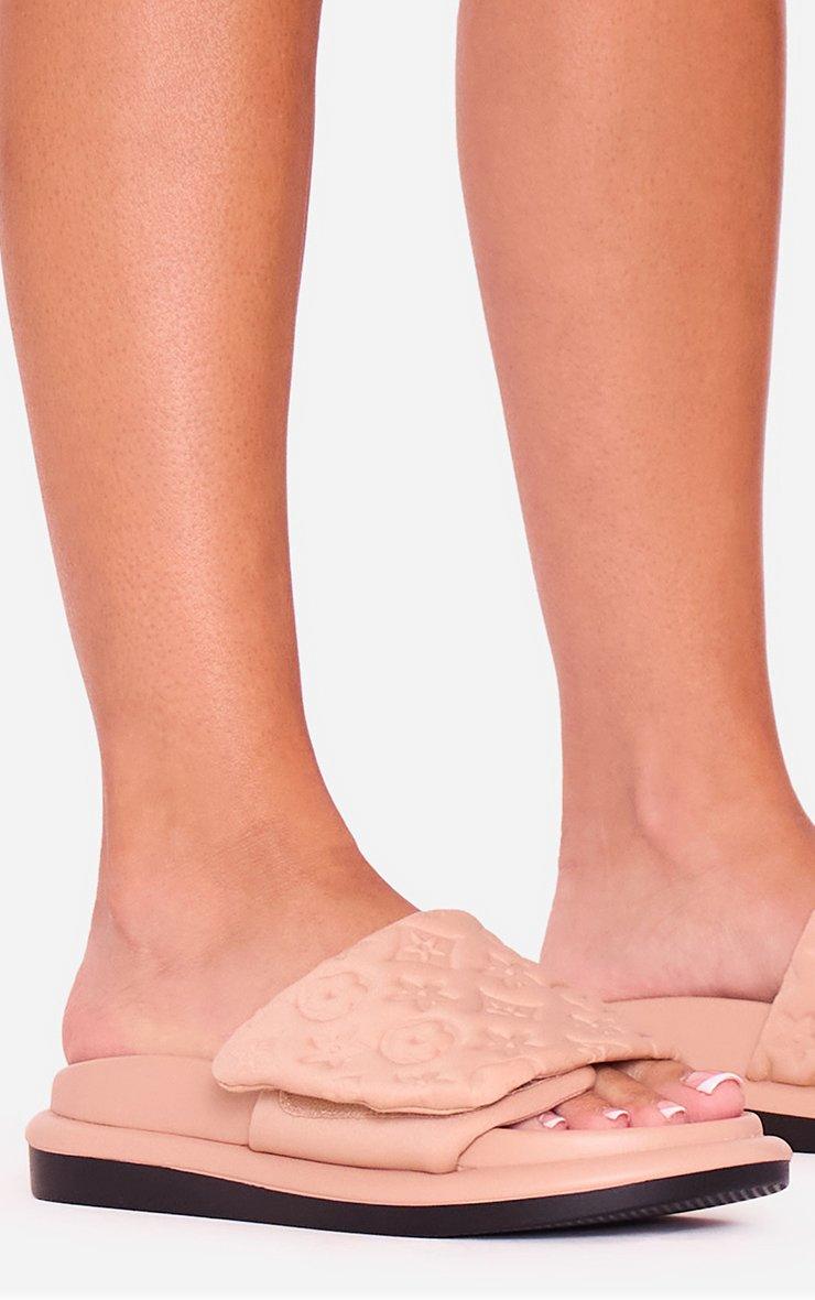 It's-A-Vibe Embossed Velcro Strap Flat Slider Sandal In Dark Nude Lycra