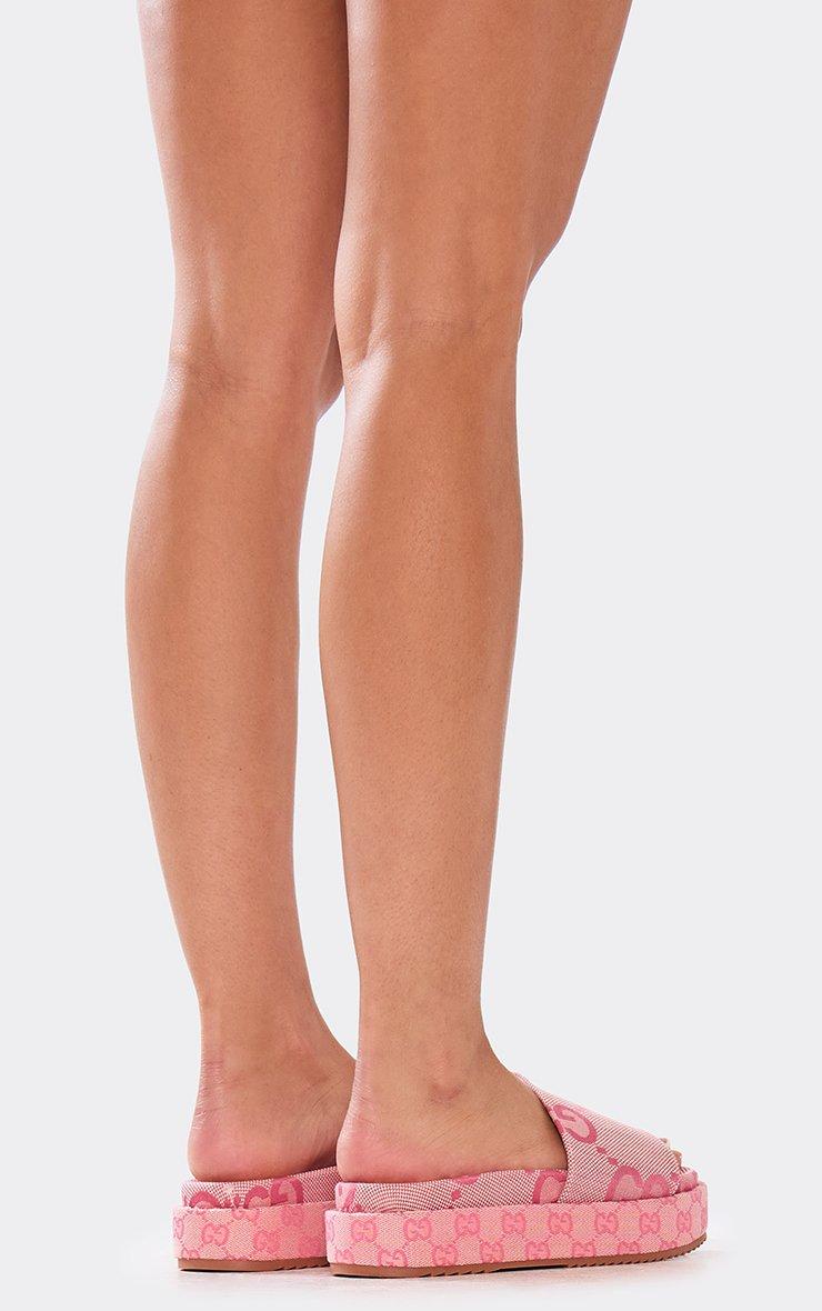 Manic Printed Detail Peep Toe Flatform Slider Sandal In Brown Fabric