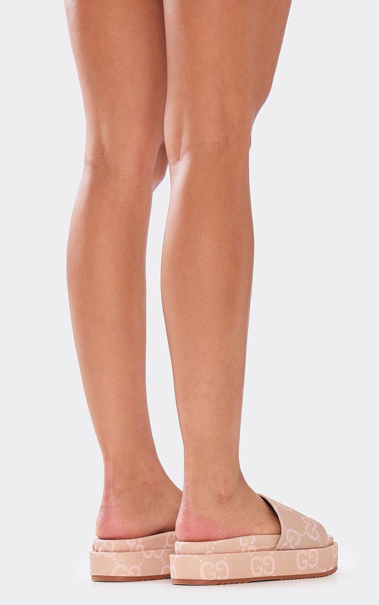Manic Printed Detail Peep Toe Flatform Slider Sandal In Brown Fabric