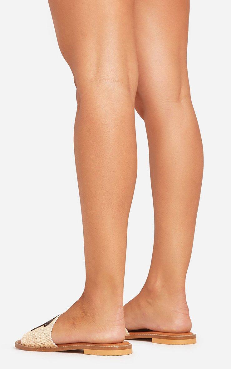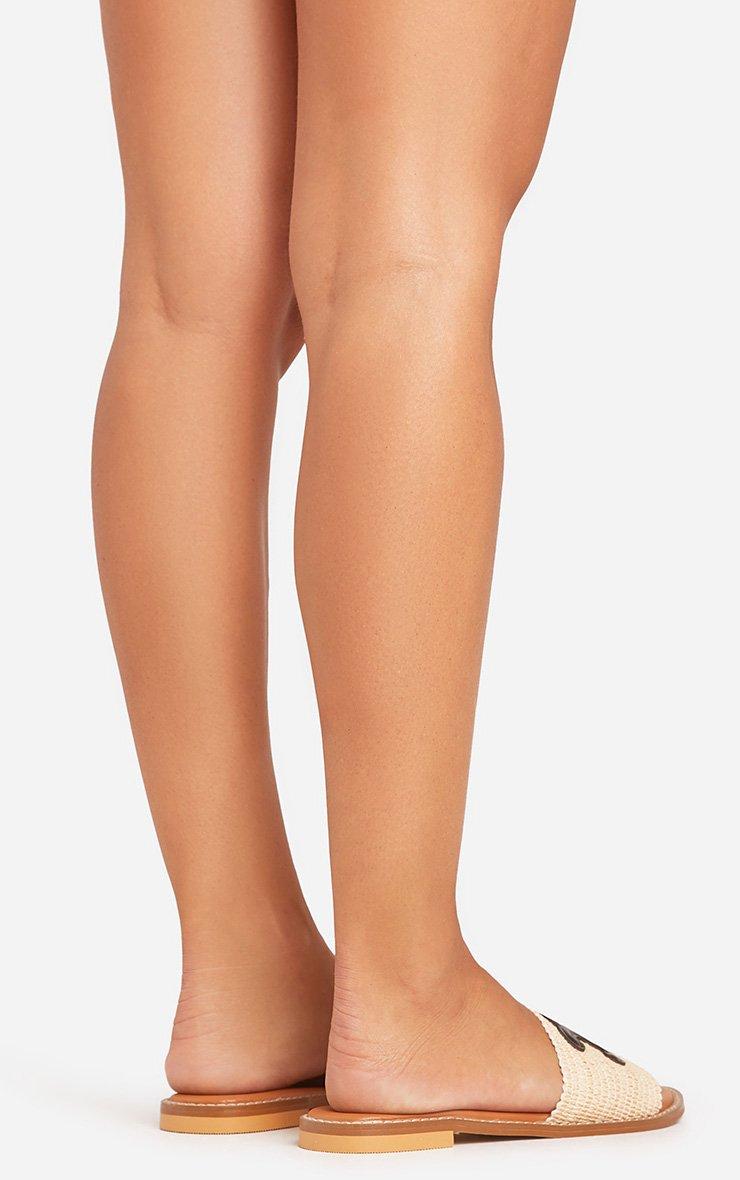 Allie Logo Detail Flat Slider Sandal In Beige Woven And Black Faux Leather