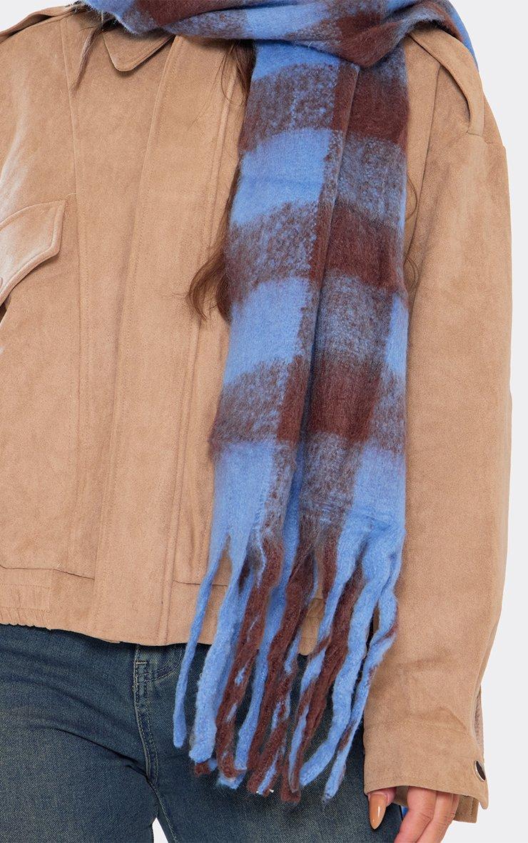Oversized Fringe Detail Scarf In Blue And Brown Checked Print