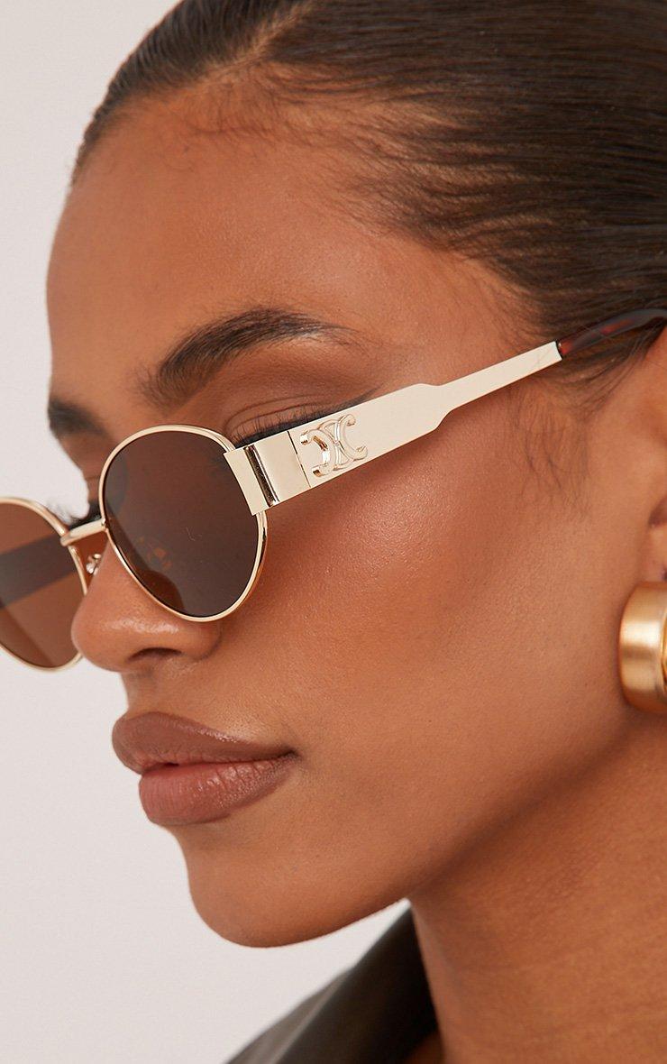 oval cateye shape side detail brown tinted lense metal frame sunglasses in gold