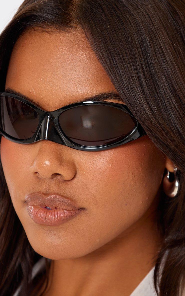 Black Lense Nose Detail Wrap Around Sunglasses In Black