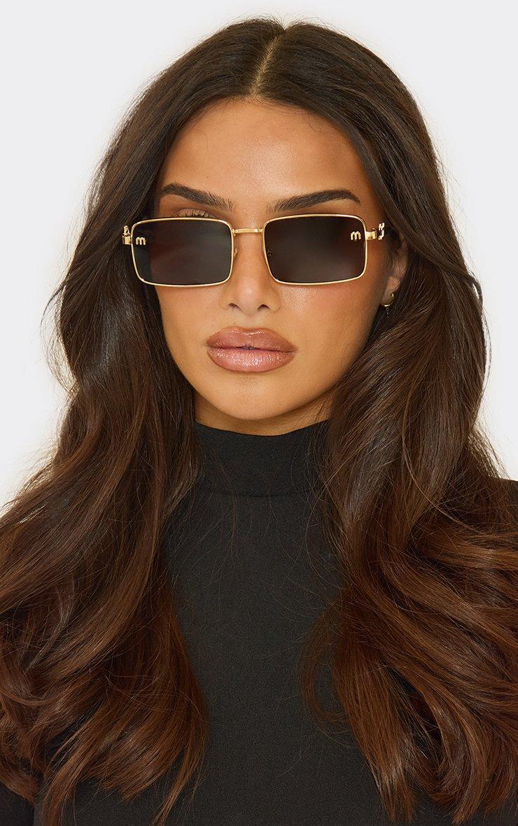 Side Logo Thin Gold Frame Rectangle Shaped Tinted Lense Sunglasses In Black