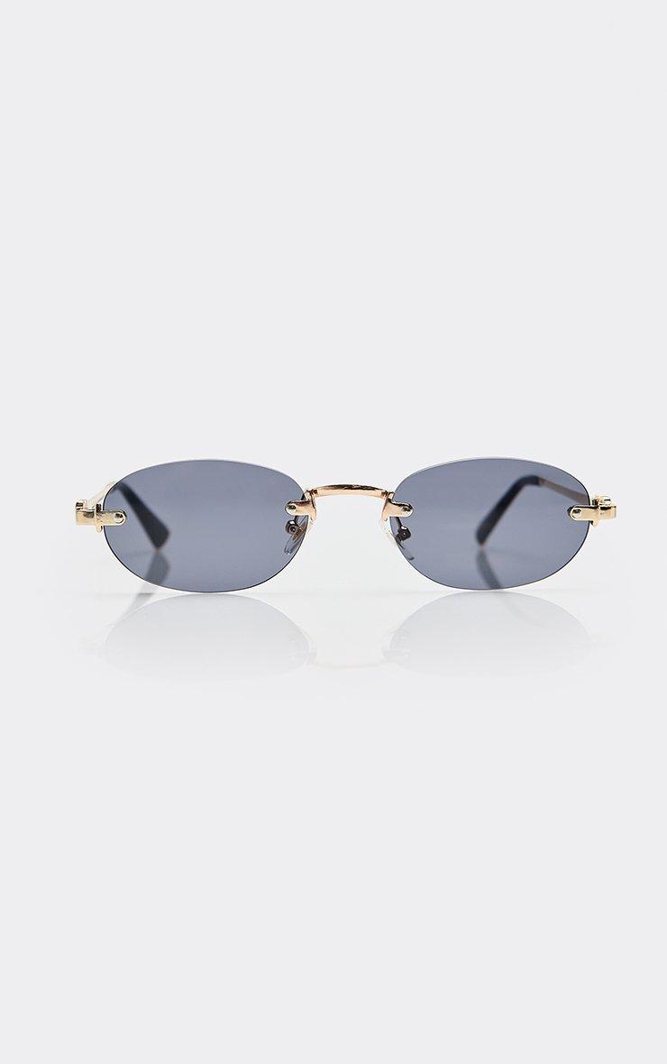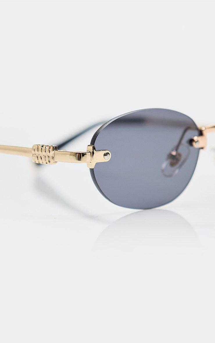 side logo oval shaped tinted lense frameless sunglasses in black and gold